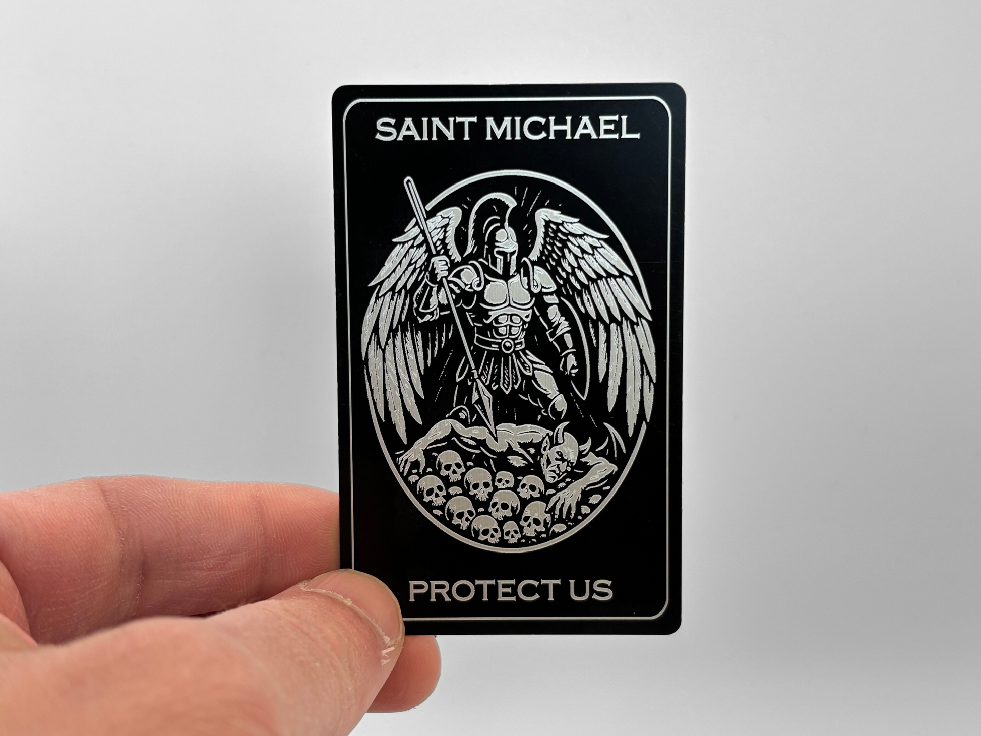 - Laser engraved Saint Michael defeating the devil